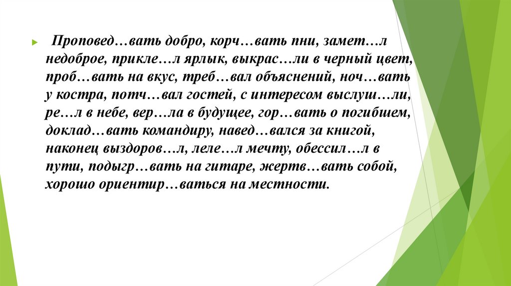 Проповед…вать добро, корч…вать пни, замет…лнедоброе, прикле…л ярлык, выкрас…ли в черный цвет,