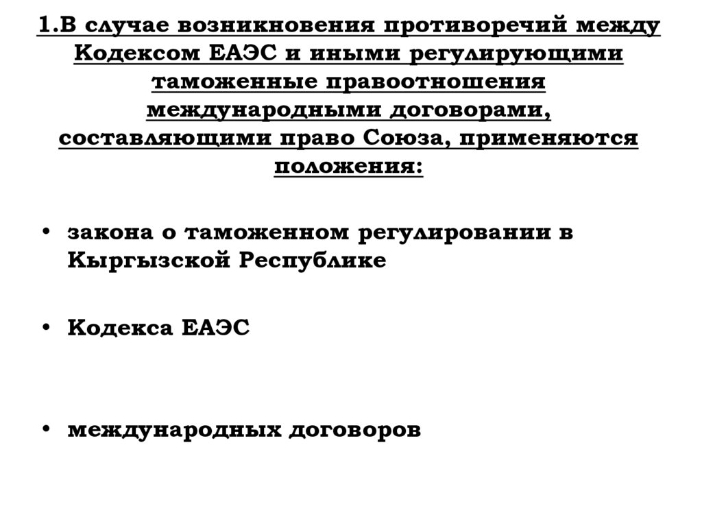 1. 1.В случае возникновения противоречий между Кодексом ЕАЭС и иными регулирующими таможенные правоотношения международными