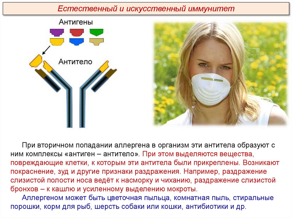 Естественный и искусственный иммунитетПри вторичном попадании аллергена в организм эти антитела образуют с
