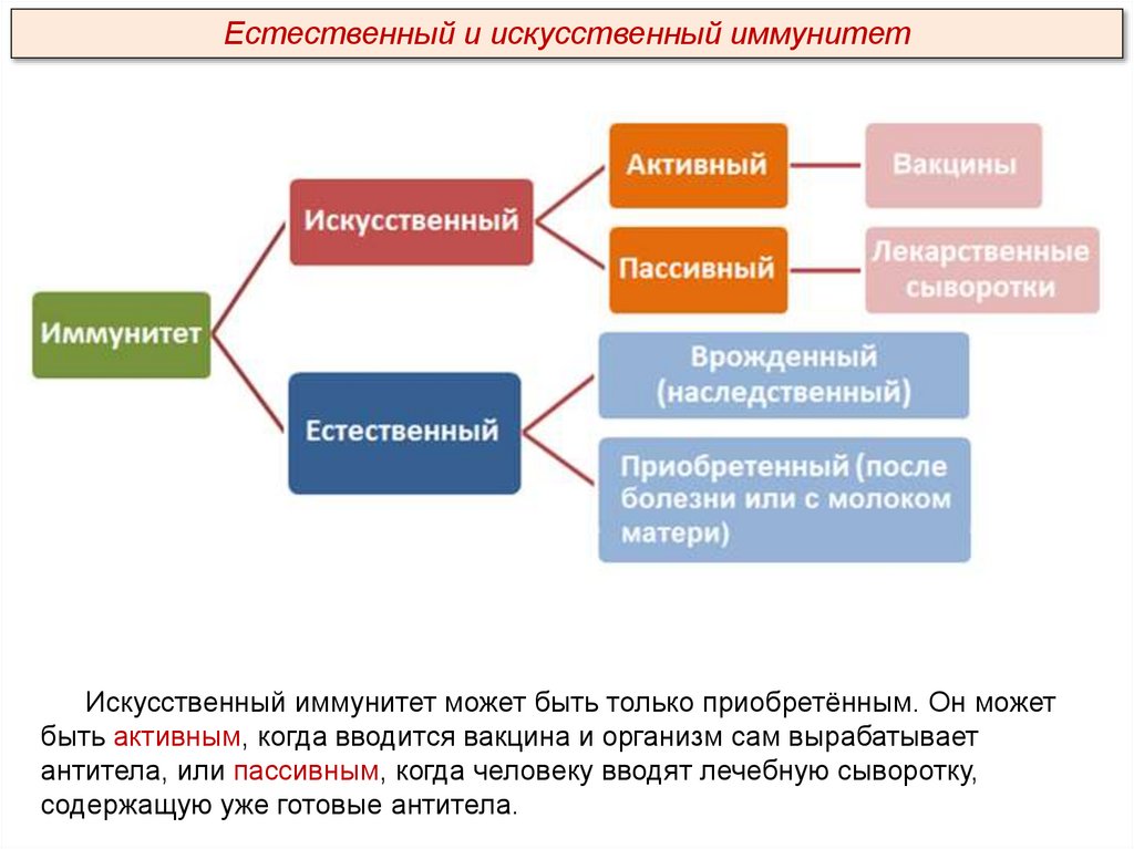 Естественный и искусственный иммунитетИскусственный иммунитет может быть только приобретённым. Он может