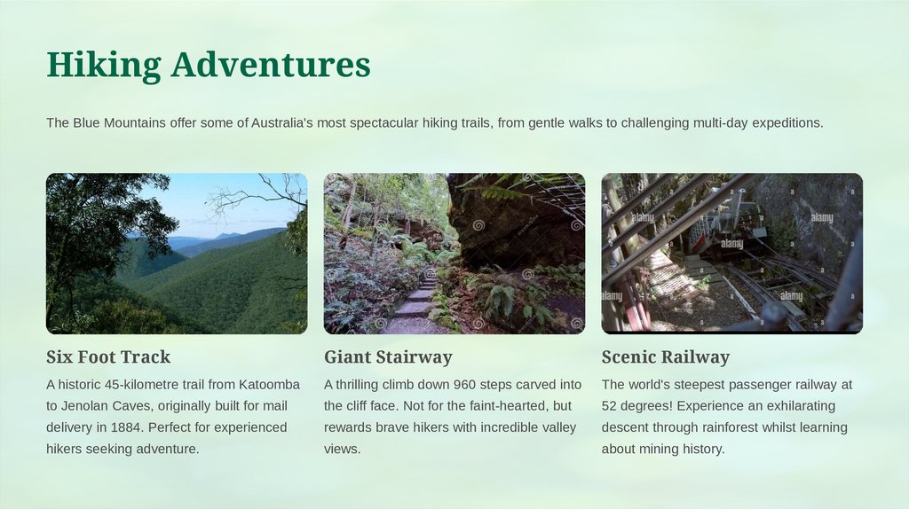 Hiking AdventuresThe Blue Mountains offer some of Australia's most spectacular hiking trails, from gentle walks to challenging multi-day expeditions.