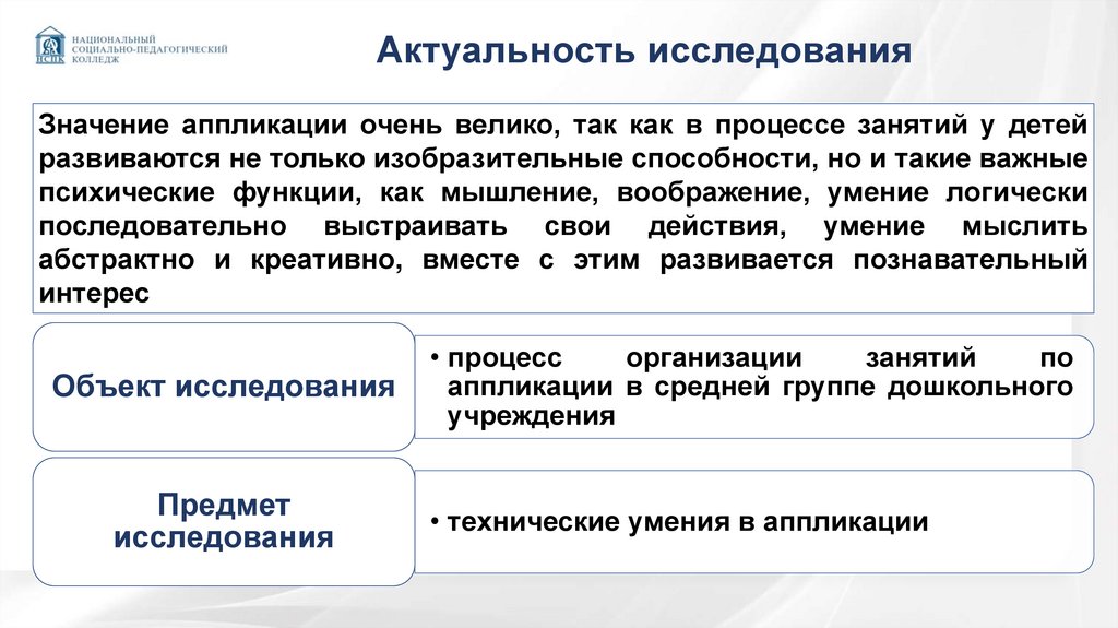 Актуальность исследованияЗначение аппликации очень велико, так как в процессе занятий у детей