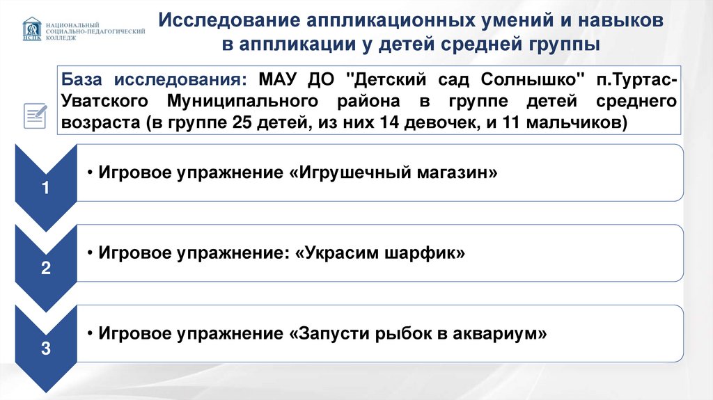 База исследования: МАУ ДО "Детский сад Солнышко" п.ТуртасУватского Муниципального района в группе детей среднего