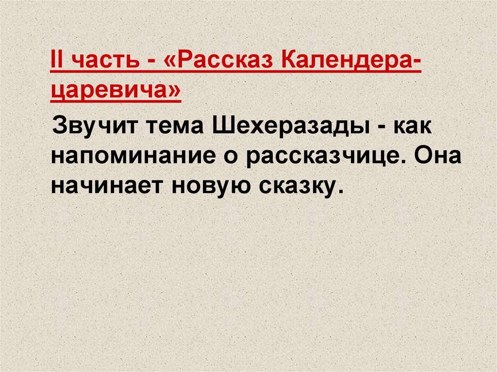 II часть - «Рассказ Календерацаревича»Звучит тема Шехеразады - как