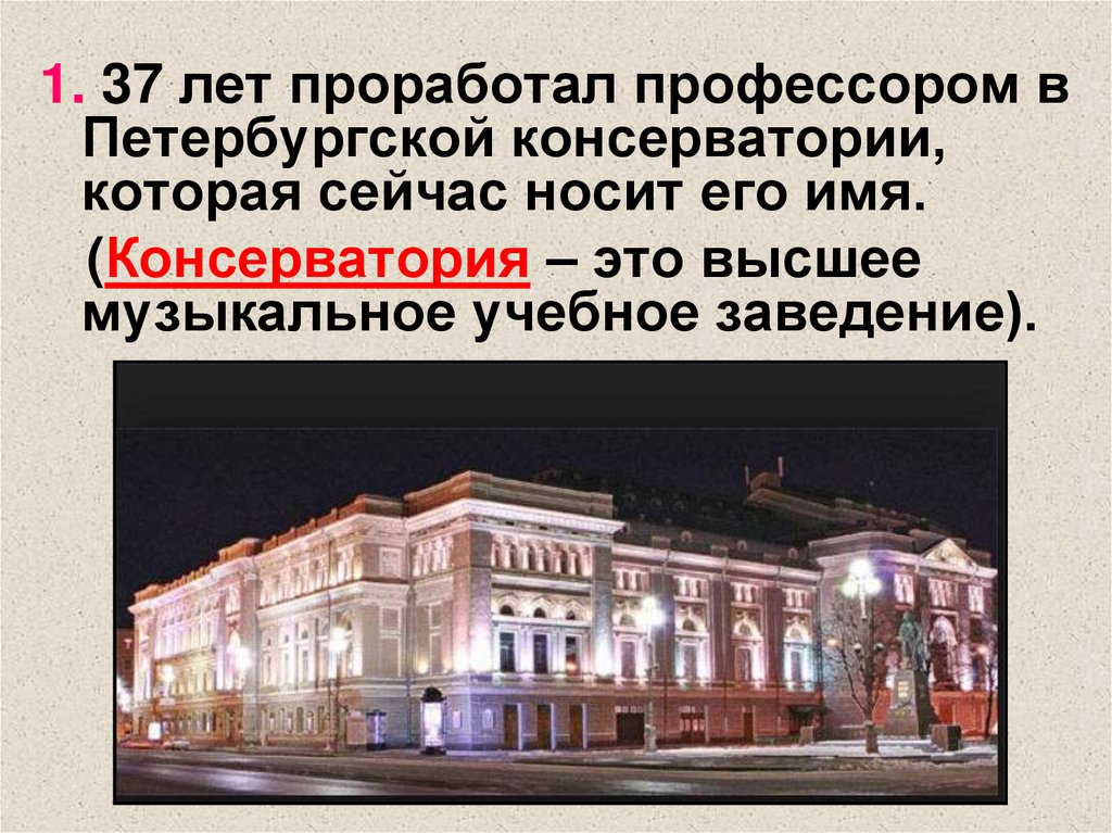 1. 37 лет проработал профессором вПетербургской консерватории,