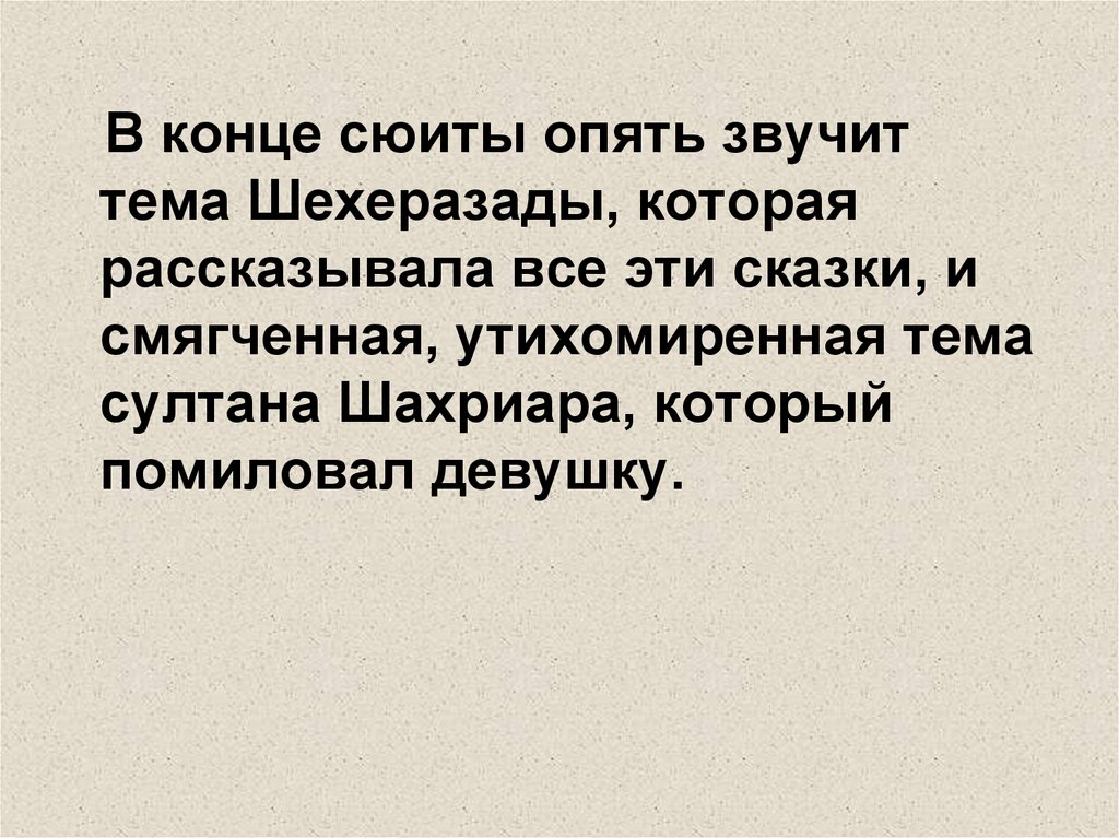 В конце сюиты опять звучиттема Шехеразады, которая