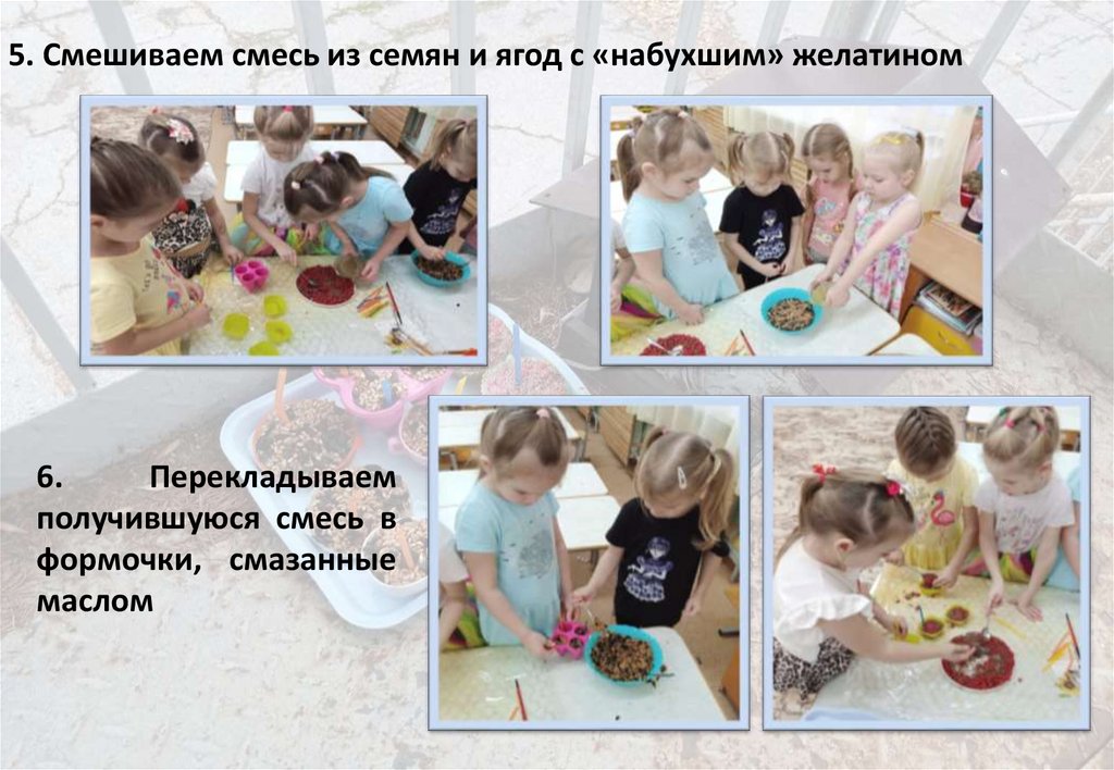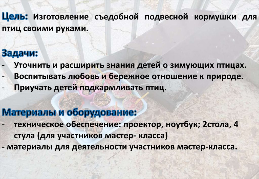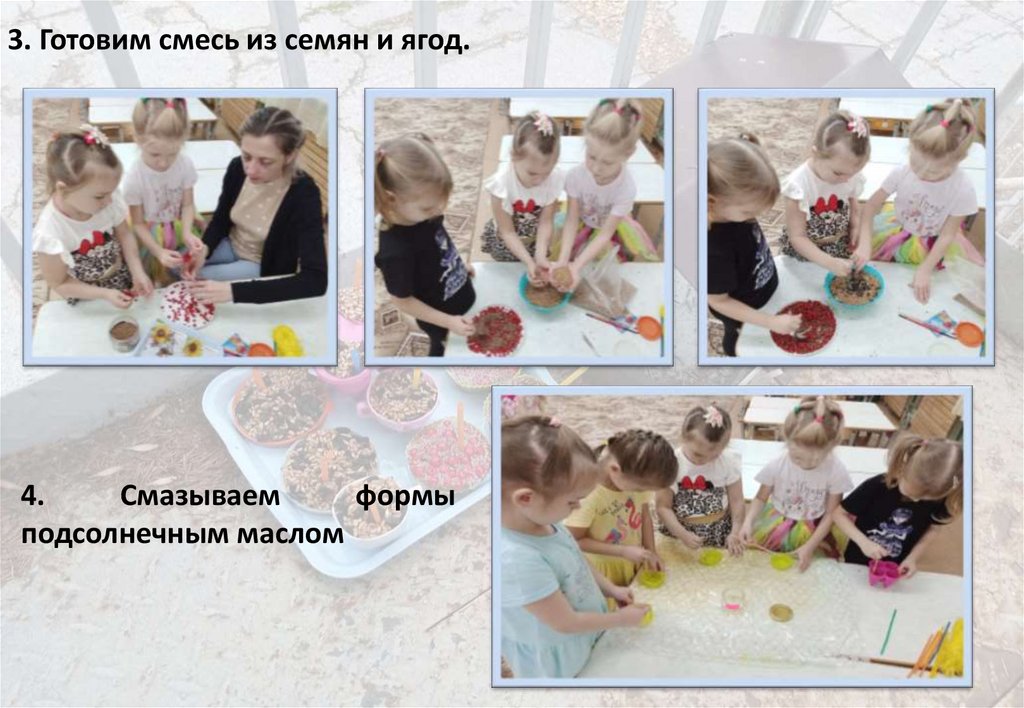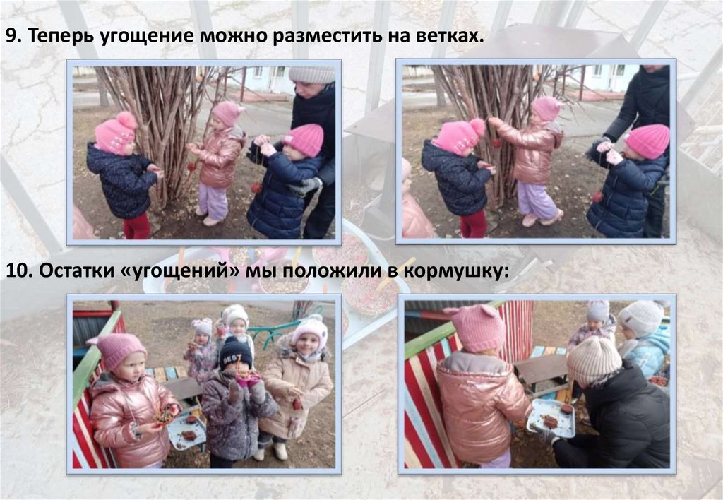 9. Теперь угощение можно разместить на ветках.10. Остатки «угощений» мы положили в кормушку: