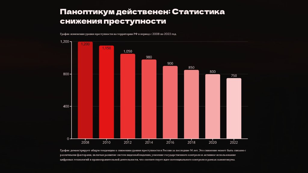 График демонстрирует общую тенденцию к снижению уровня преступности в России за последние 14 лет. Это снижение может быть связано с