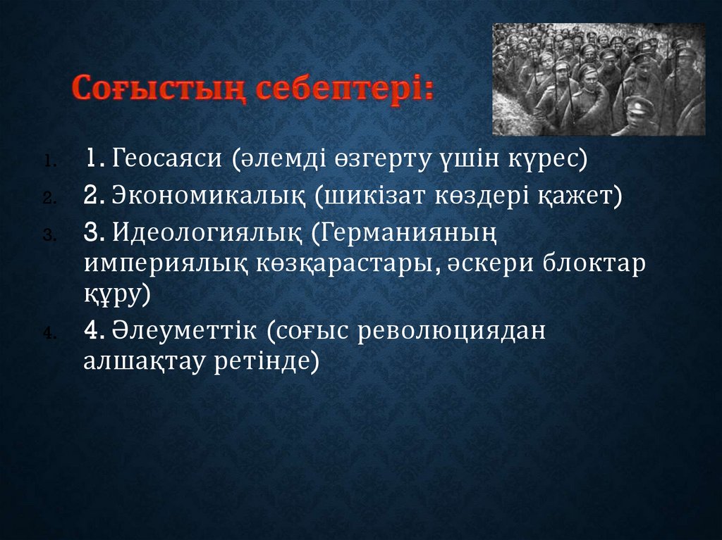 ЖОСПАРЫ:Бірінші дүниежізілік соғыстың шығу себептері және оның