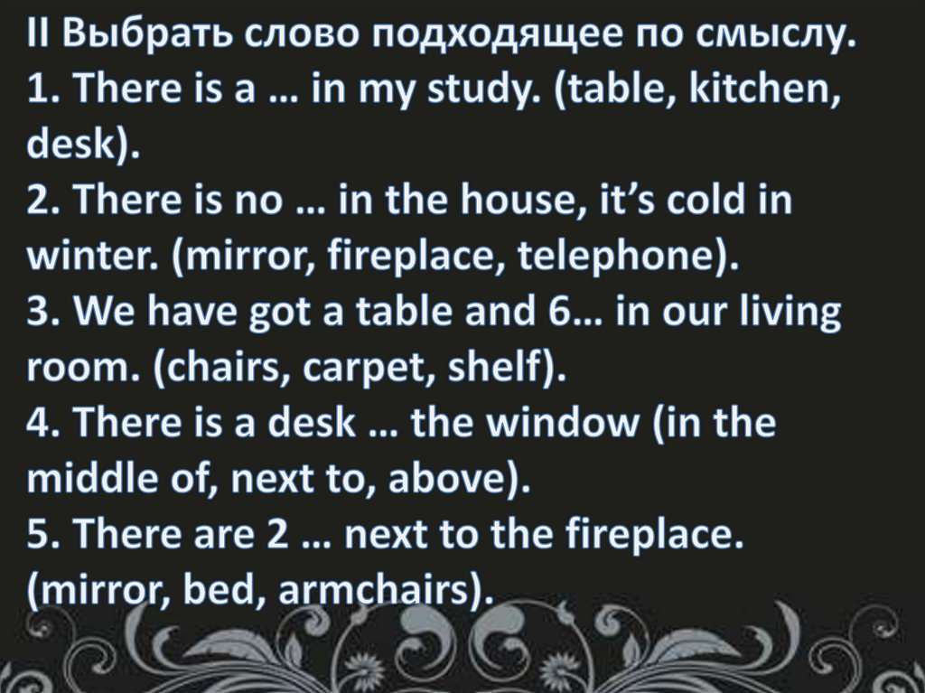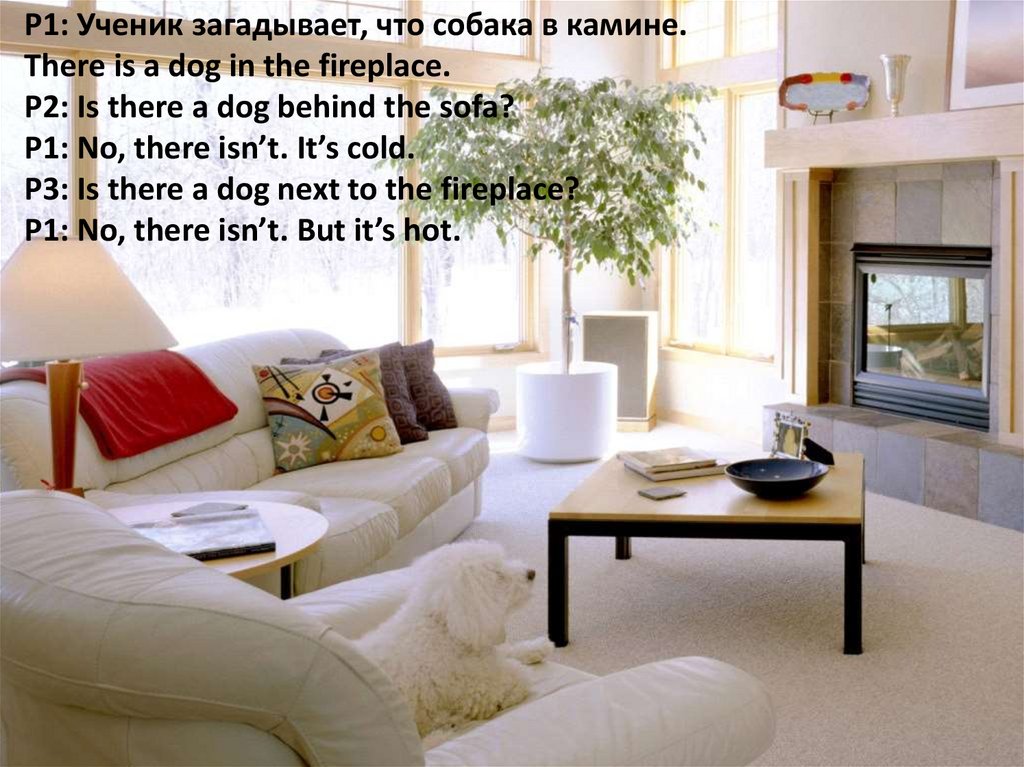 P1: Ученик загадывает, что собака в камине.There is a dog in the fireplace.
