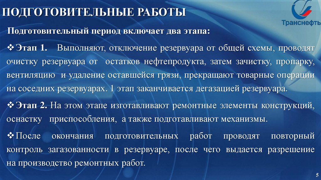 очистку резервуара от остатков нефтепродукта, затем зачистку, пропарку,