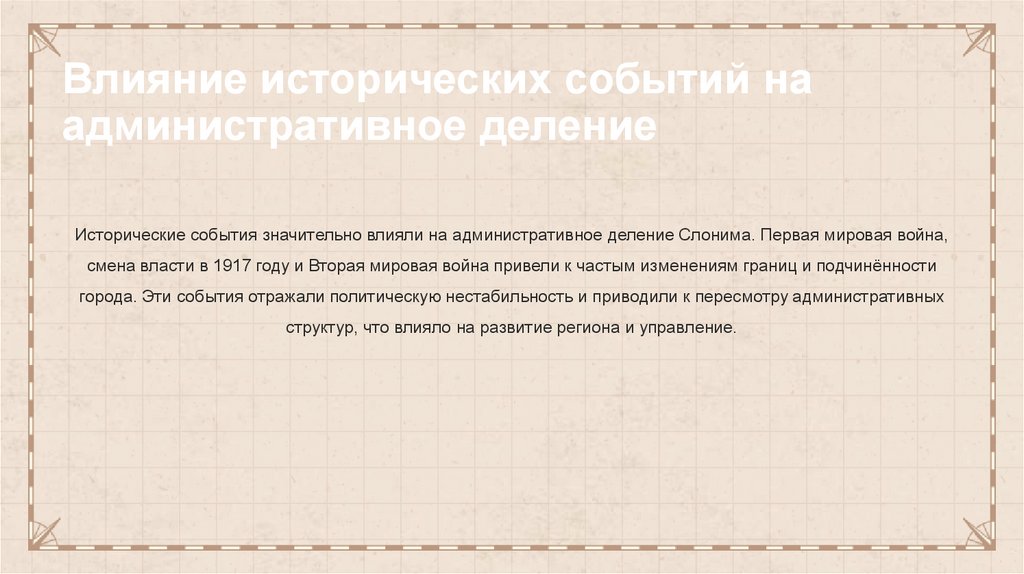 Исторические события значительно влияли на административное деление Слонима. Первая мировая война,