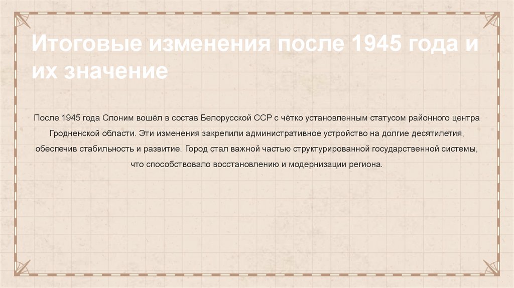 После 1945 года Слоним вошёл в состав Белорусской ССР с чётко установленным статусом районного центра