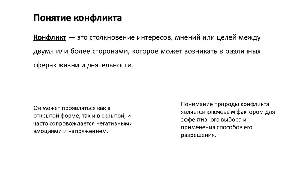 Понятие конфликтаКонфликт — это столкновение интересов, мнений или целей между