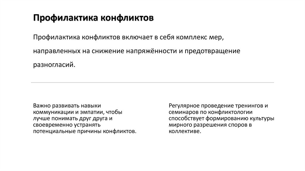 Профилактика конфликтовПрофилактика конфликтов включает в себя комплекс мер,