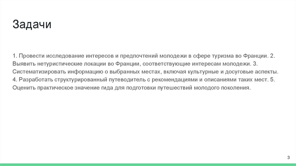 Задачи1. Провести исследование интересов и предпочтений молодежи в сфере туризма во Франции. 2.