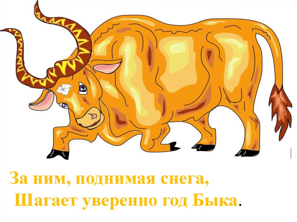 За ним, поднимая снега,Шагает уверенно год Быка.