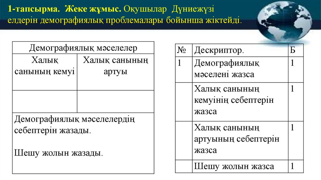 1-тапсырма. Жеке жұмыс. Оқушылар Дүниежүзіелдерін демографиялық проблемалары бойынша жіктейді.