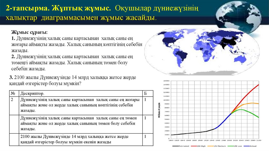 2-тапсырма. Жұптық жұмыс. Оқушылар дүниежүзініңхалықтар диаграммасымен жұмыс жасайды.