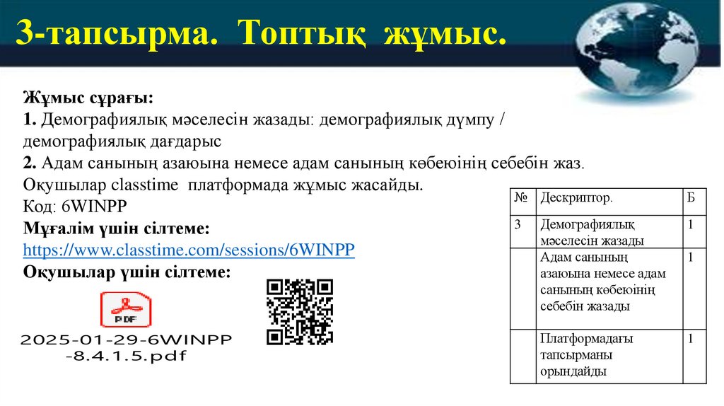 Сабақтың тақырыбы: Демографиялық проблемалар
