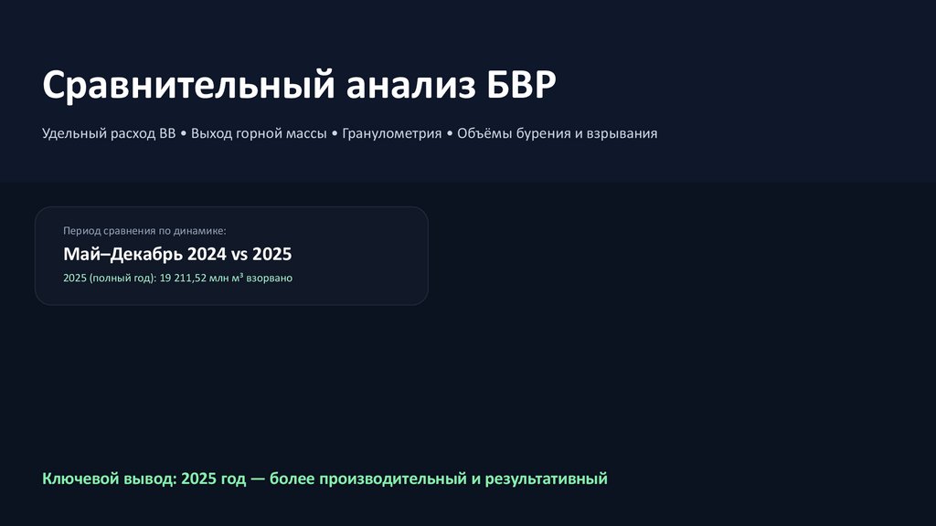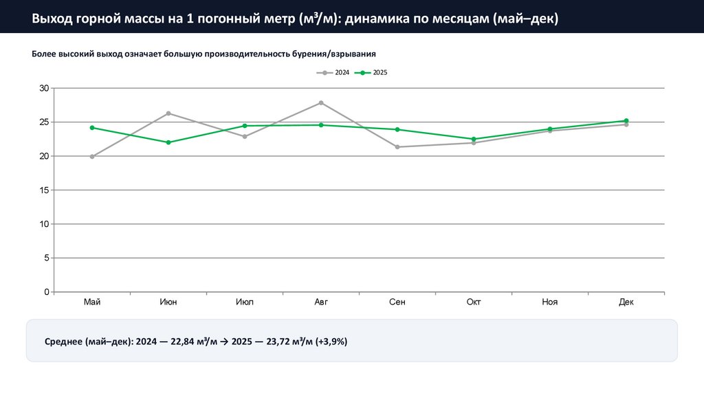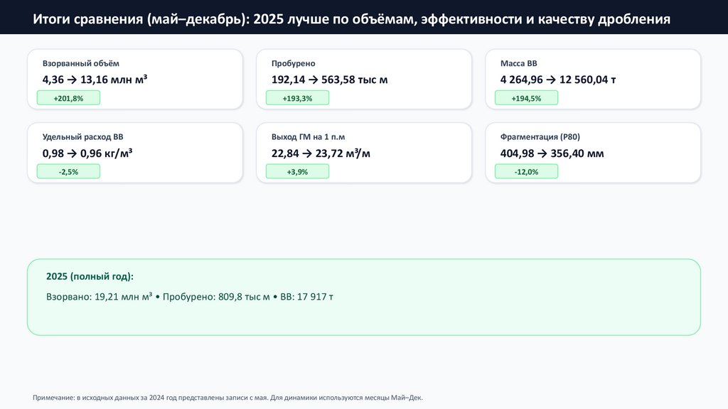 Итоги сравнения (май–декабрь): 2025 лучше по объёмам, эффективности и качеству дробленияВзорванный объём