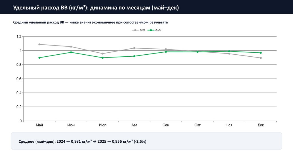Среднее (май–дек): 2024 — 0,981 кг/м³ → 2025 — 0,956 кг/м³ (-2,5%)
