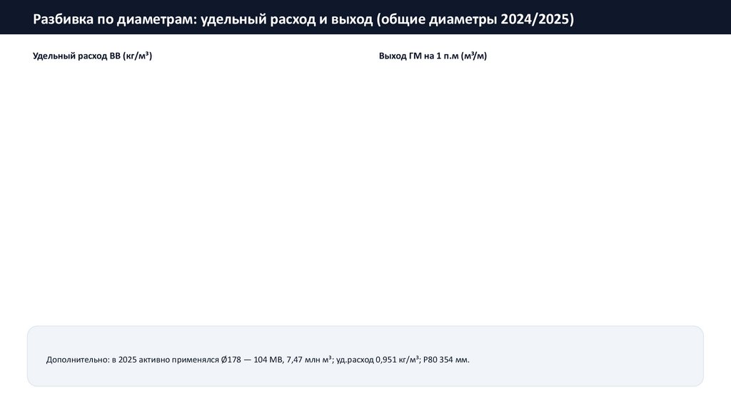 Дополнительно: в 2025 активно применялся Ø178 — 104 МВ, 7,47 млн м³; уд.расход 0,951 кг/м³; P80 354 мм.