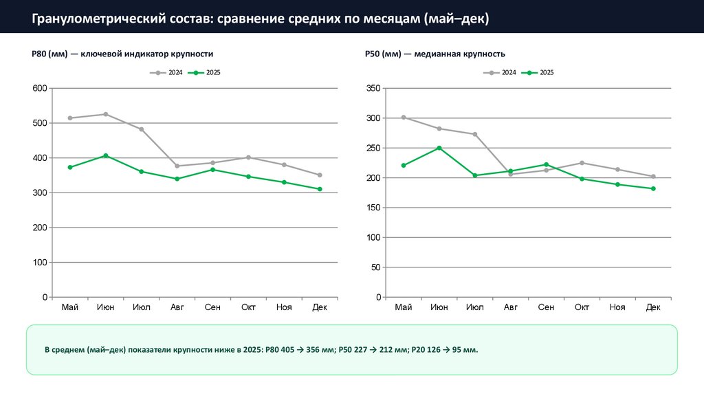 В среднем (май–дек) показатели крупности ниже в 2025: P80 405 → 356 мм; P50 227 → 212 мм; P20 126 → 95 мм.