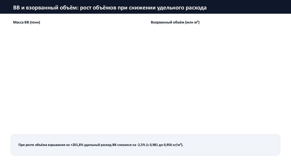 При росте объёма взрывания на +201,8% удельный расход ВВ снизился на -2,5% (с 0,981 до 0,956 кг/м³).