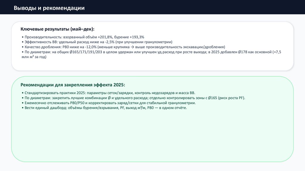• По диаметрам: закрепить лучшие комбинации Ø и удельного расхода; отдельно контролировать зоны с Ø165 (риск роста PF).