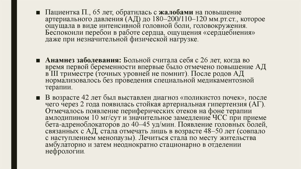 ■ Пациентка П., 65 лет, обратилась с жалобами на повышениеартериального давления (АД) до 180–200/110–120 мм.рт.ст., которое