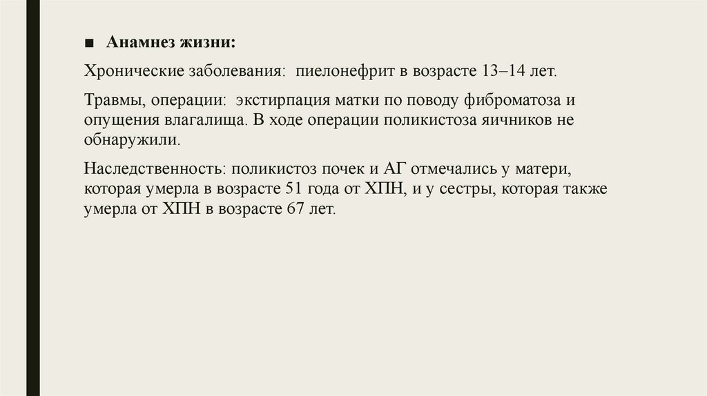 ■ Анамнез жизни:Хронические заболевания: пиелонефрит в возрасте 13–14 лет.