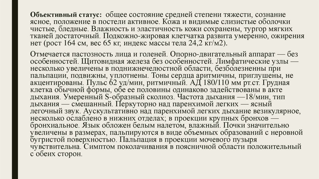 Объективный статус: общее состояние средней степени тяжести, сознаниеясное, положение в постели активное. Кожа и видимые слизистые оболочки