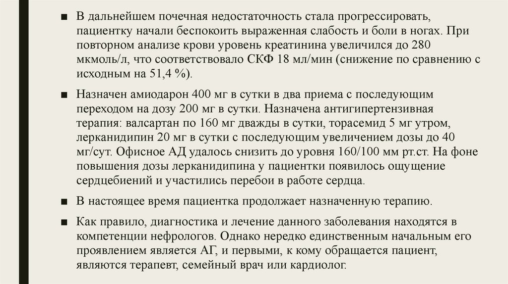 ■ В дальнейшем почечная недостаточность стала прогрессировать,пациентку начали беспокоить выраженная слабость и боли в ногах. При