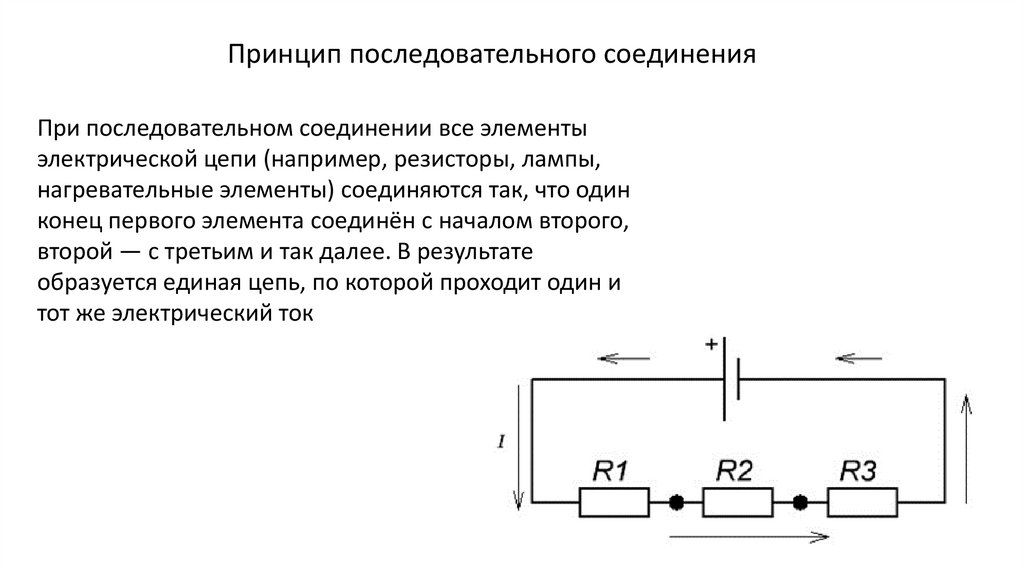 Принцип последовательного соединенияПри последовательном соединении все элементы