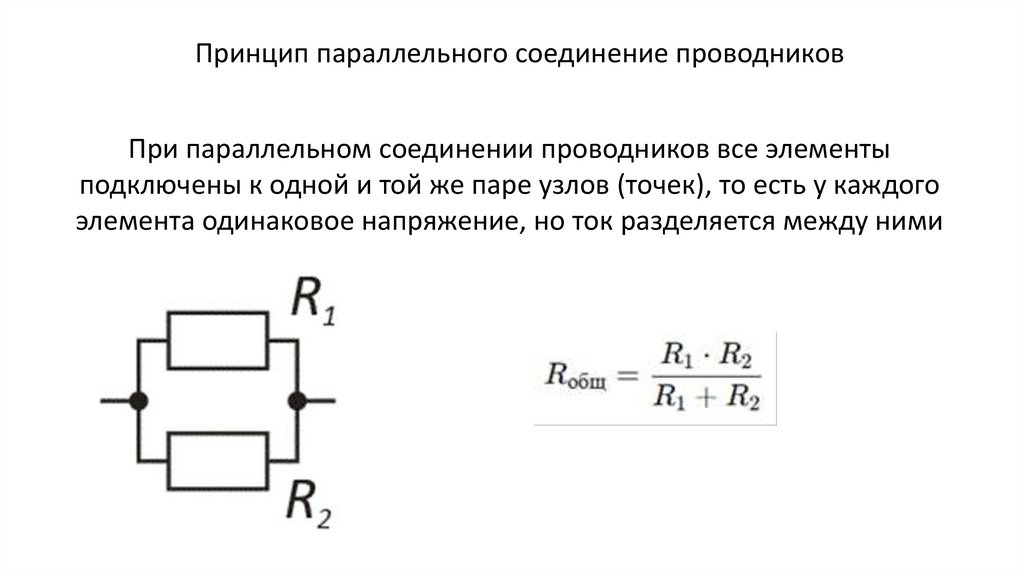 Принцип параллельного соединение проводниковПри параллельном соединении проводников все элементы