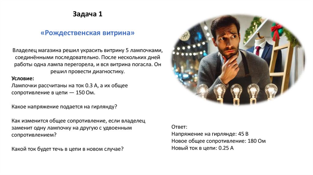 • Находит напряжение на гирлянде• Определяет общее сопротивление