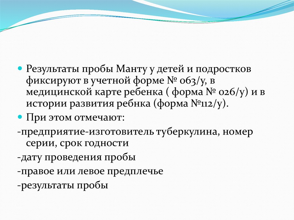 Результаты пробы Манту у детей и подростковфиксируют в учетной форме № 063/у, в