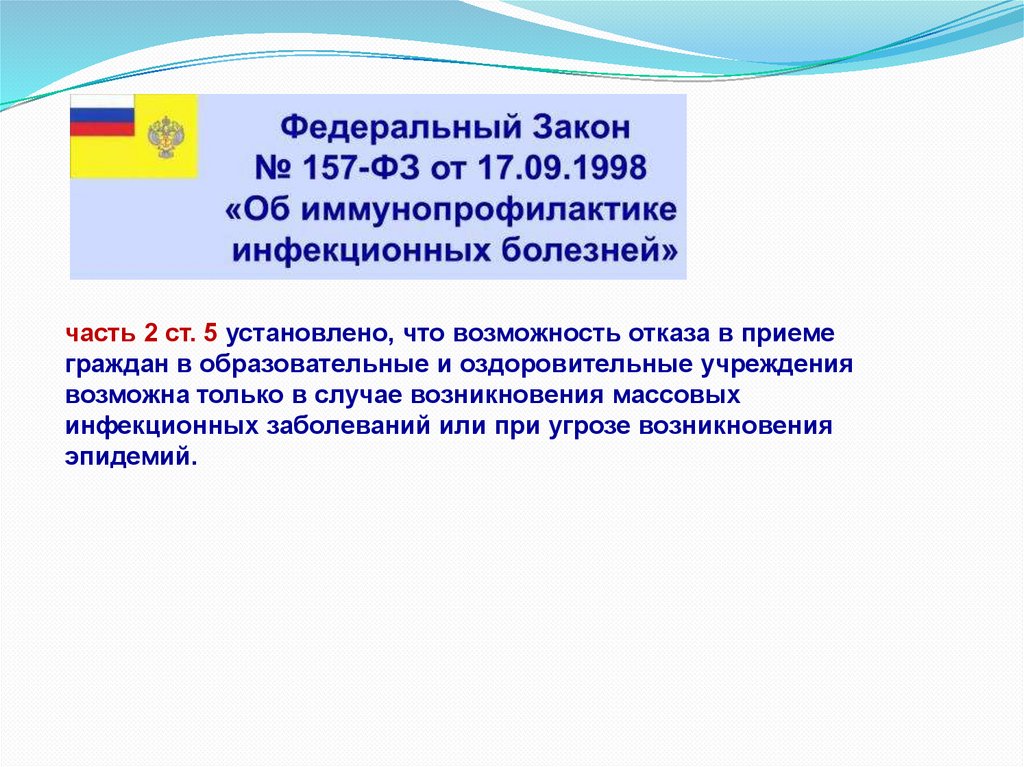 ФЗ №157 от 17.10.98г.» Об иммунопрофилактике инфекционных болезней.»