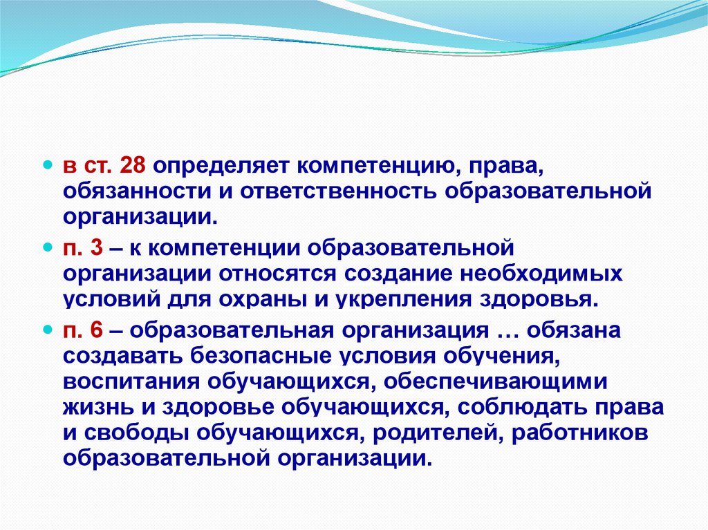 в ст. 28 определяет компетенцию, права,обязанности и ответственность образовательной