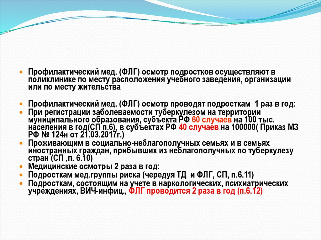 Профилактический мед. (ФЛГ) осмотр подростков осуществляют вполиклинике по месту расположения учебного заведения, организации