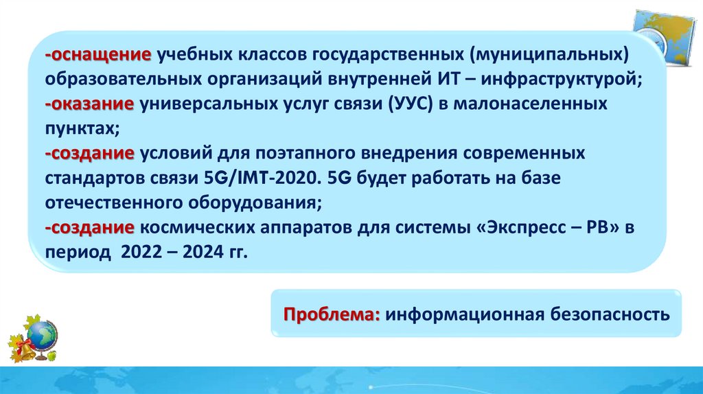 -оснащение учебных классов государственных (муниципальных)образовательных организаций внутренней ИТ – инфраструктурой;