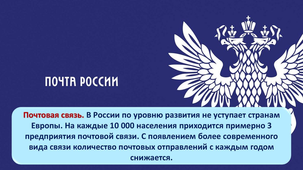 Почтовая связь. В России по уровню развития не уступает странамЕвропы. На каждые 10 000 населения приходится примерно 3