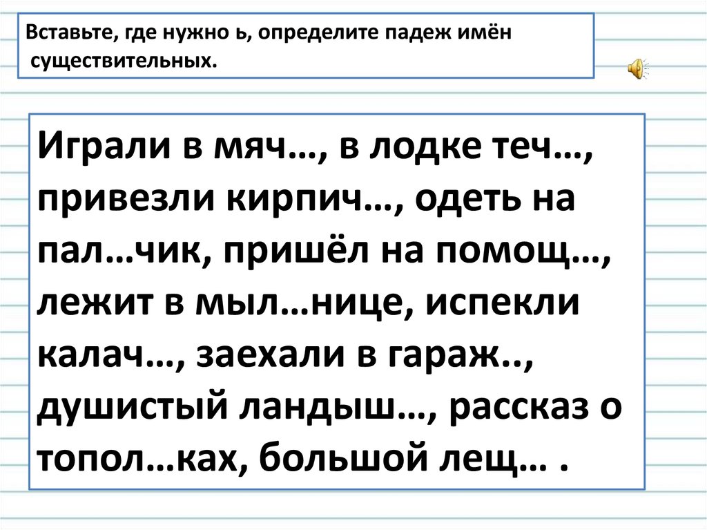Вставьте, где нужно ь, определите падеж имёнсуществительных.
