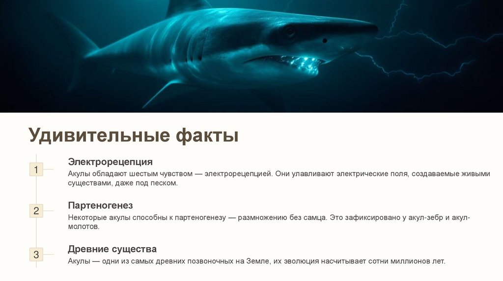 Акулы обладают шестым чувством — электрорецепцией. Они улавливают электрические поля, создаваемые живыми