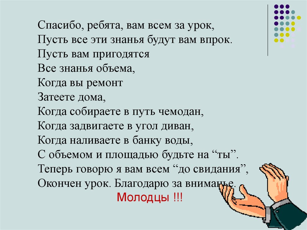 Спасибо, ребята, вам всем за урок,Пусть все эти знанья будут вам впрок.
