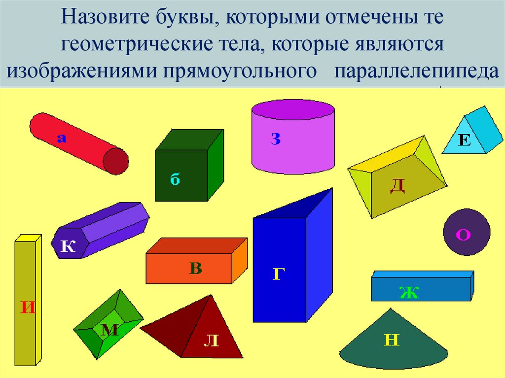 Назовите буквы, которыми отмечены тегеометрические тела, которые являются