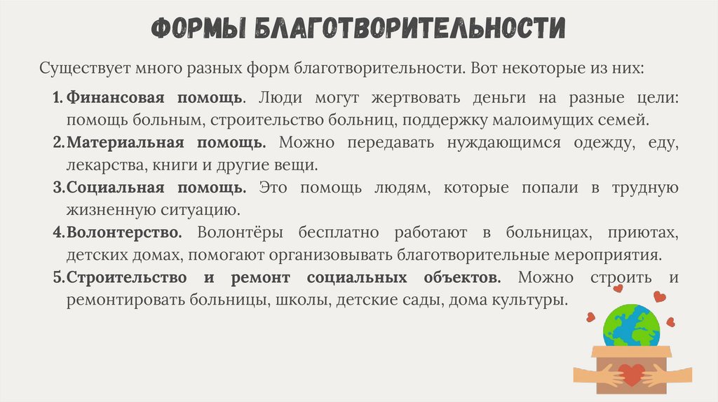 Формы благотворительностиСуществует много разных форм благотворительности. Вот некоторые из них: