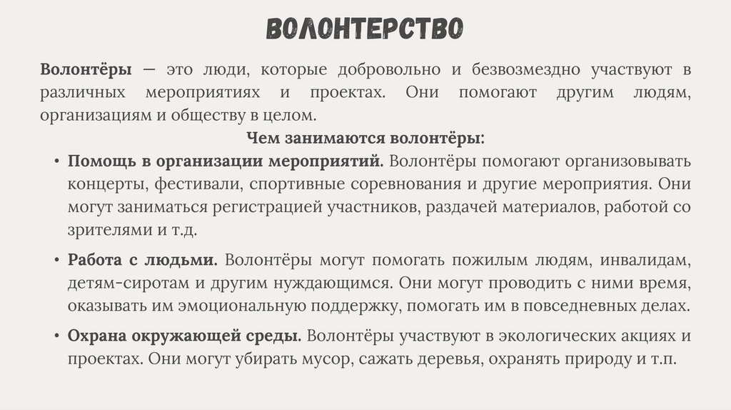 ВолонтерствоВолонтёры — это люди, которые добровольно и безвозмездно участвуют в