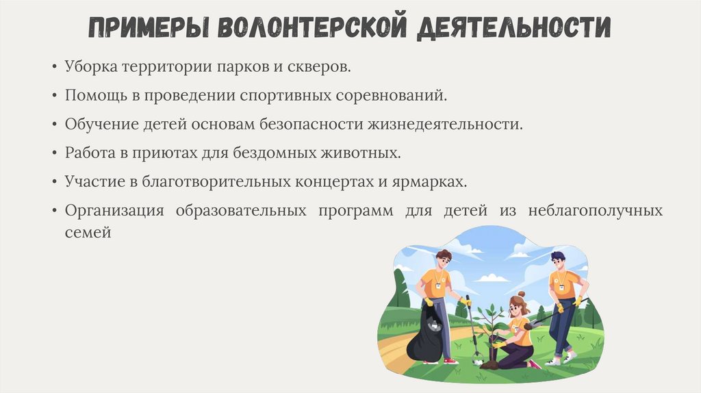 Примеры волонтерской деятельности• Уборка территории парков и скверов.